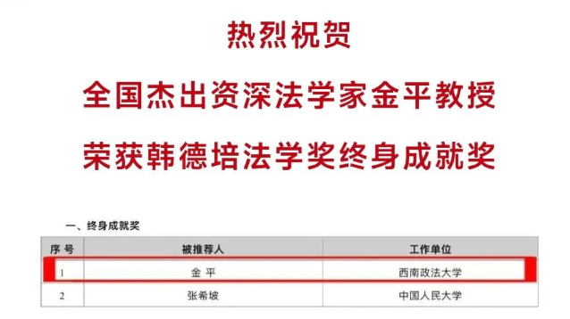 三度参与立法奠基中国民法。作为新中国民法事业的奠基人之一,金平教授于1954年、1962年、1979年三次受邀参与民法典起草工作,见证了我国民法发展的关键历程。2020年《中华人民共和国民法典》颁布时,已近期颐之年的他激动地表示:“此生再无遗憾了!”这段跨越66年的执着坚守,生动展现了中国法治建设的艰辛历程与辉煌成就。